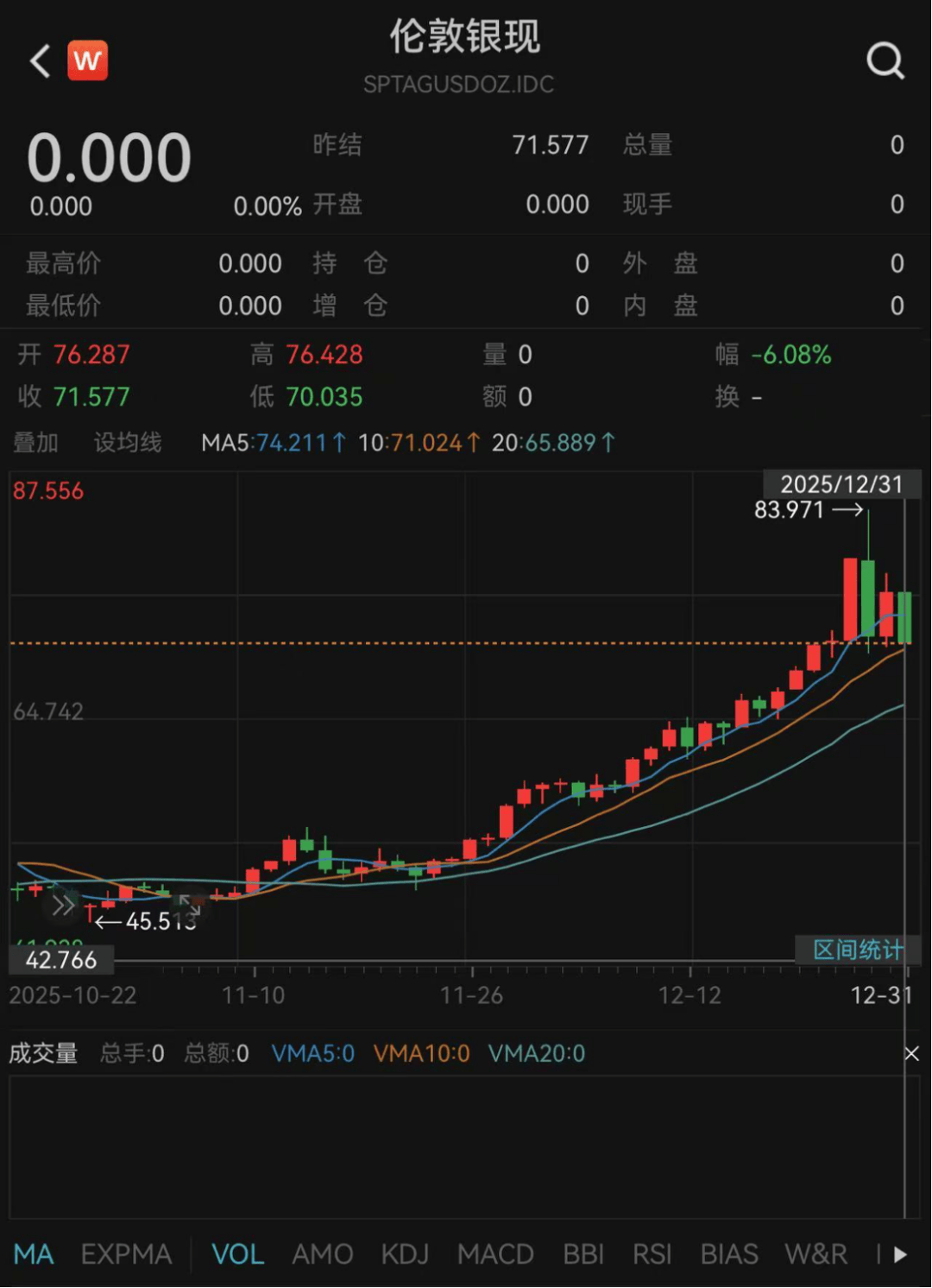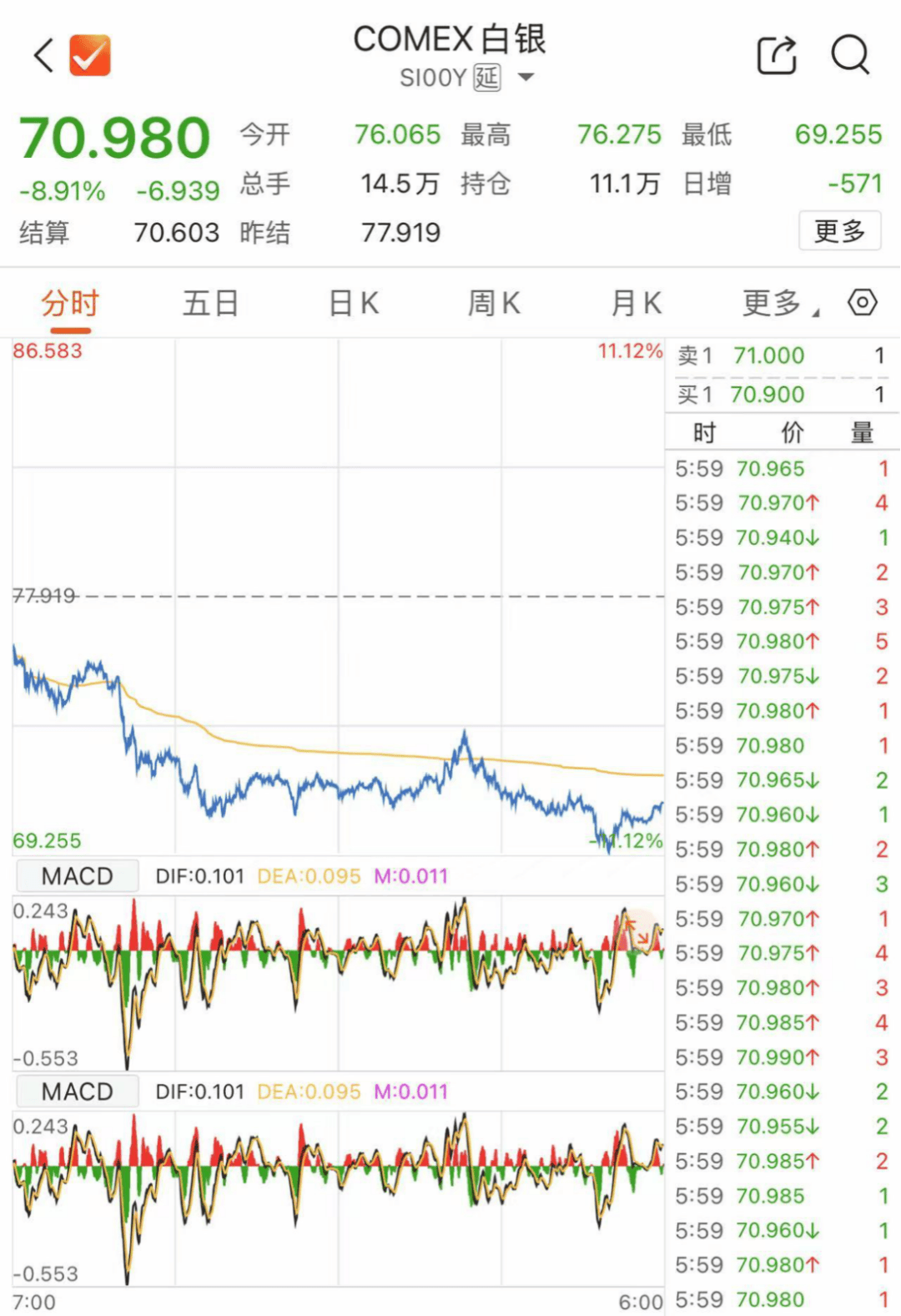 与此同时,贵金属市场剧烈波动风险正在积聚。隔夜,白银价格又一次跳水。伦敦现货白银盘中跌超8%,从最高76美元/盎司左右一路跌至70美元/盎司附近。COMEX白银期价大跌近9%,最低价格一度跌破70美元/盎司关口。