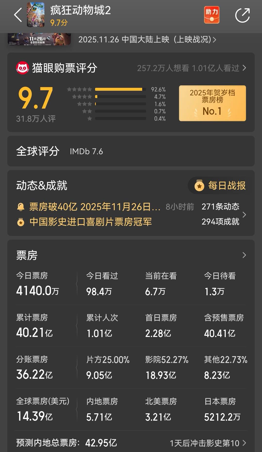 《疯狂动物城2》上映第36天单日票房4200万元,排在日榜第三,猫眼专业版将其最终预测总票房调高到了43亿元,灯塔专业版的预测调高到了43.5亿元。