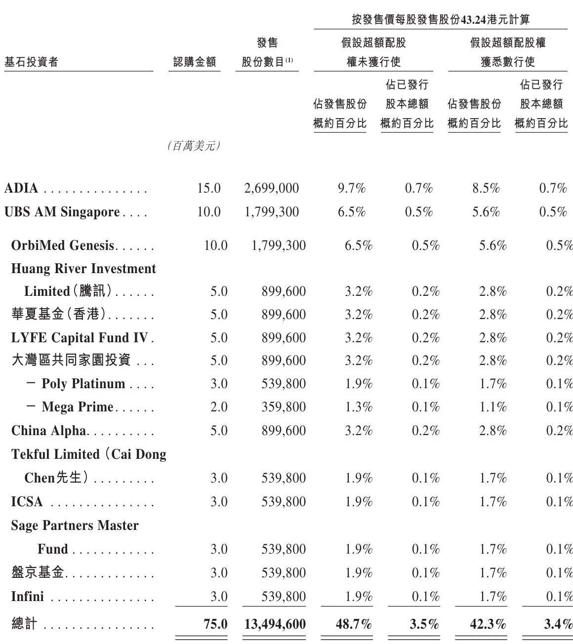 其中,ADIA认购1500万美元,UBS AM Singapore、OrbiMed Genesis分别认购1000万美元,讯旗下Huang River Investment、华夏基金(香港)、LYFE Capital Fund IV、大湾区共同家园投资、China Alpha分别认购500万美元,Tekful Limited (Cai Dong Chen)、ICSA、Sage Partners Master Fund、盘京基金、Infini分别认购300万美元。