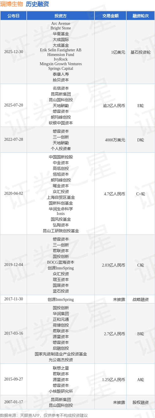 证券之星消息,根据天眼查APP于12月30日公布的信息整理,苏州瑞博生物技术股份有限公司基石投资轮融资,融资额1亿美元,参与投资的机构包括Arc Avenue,Bright Stone,华夏基金,大成国际,大成基金,Erik Selin Fastigheter AB,Himension Fund,IvyRock,Mingxin Growth Ventures,Springs Capital,泰康人寿,拾贝资本。
