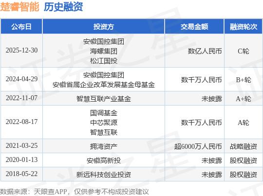 【投融资动态】楚睿智能C轮融资,融资额数亿人民币,投资方为安徽国控集团、海螺集团等