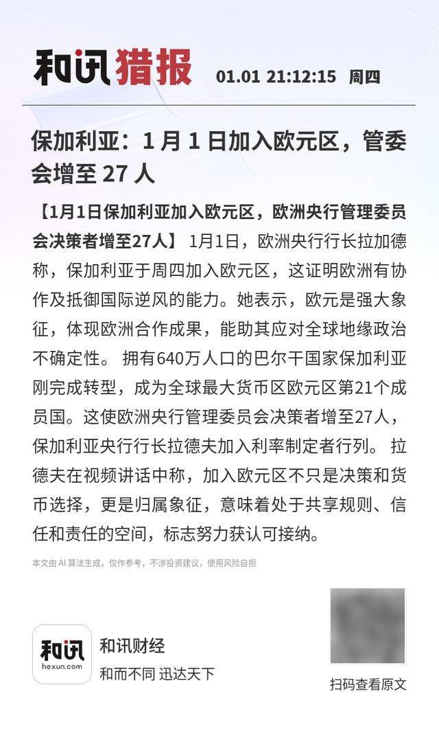 【1月1日保加利亚加入欧元区,欧洲央行管理委员会决策者增至27人】1月1日,欧洲央行行长拉加德称,保加利亚于周四加入欧元区,这证明欧洲有协作及抵御国际逆风的能力。她表示,欧元是强大象征,体现欧洲合作成果,能助其应对全球地缘政治不确定性。拥有640万人口的巴尔干国家保加利亚刚完成转型,成为全球最大货币区欧元区第21个成员国。这使欧洲央行管理委员会决策者增至27人,保加利亚央行行长拉德夫加入利率制定者行列。拉德夫在视频讲话中称,加入欧元区不只是决策和货币选择,更是归属象征,意味着处于共享规则、信任和责任的空间,标志努力获认可接纳。