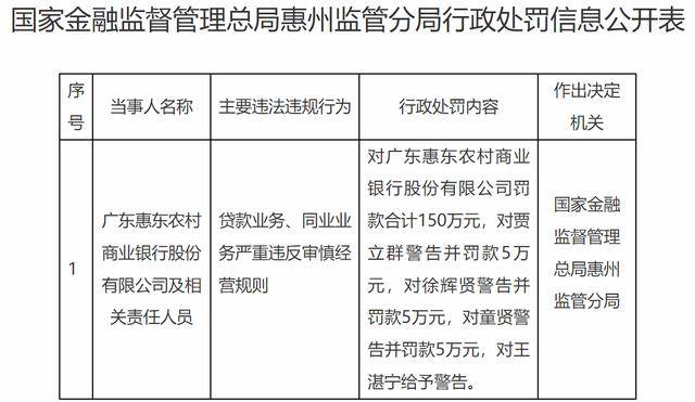 此外,广东惠东农村商业银行股份有限公司相关责任人员贾立群、徐辉贤、童贤分别被警告并处罚款5万元,王湛宁被给予警告。