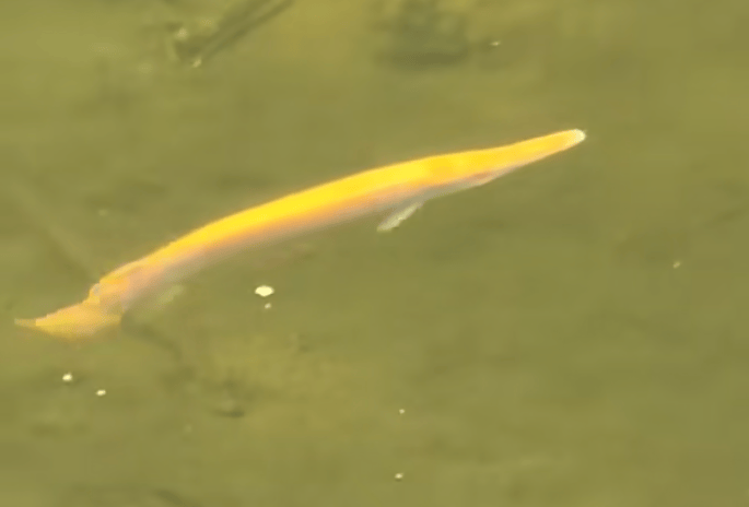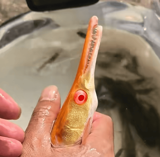 不知道是过了多久,最终这个地笼还真的是把这只鳄雀鳝给勾引进去了。博主捧着这条鳄雀鳝展示的时候,可以看到这家伙的眼睛居然是红色的,跟其鱼体一样饱和度很高,鱼体的侧面是金黄色的。