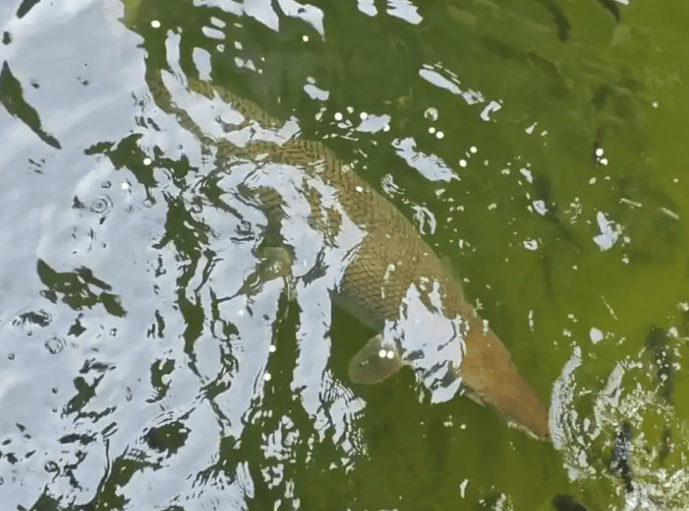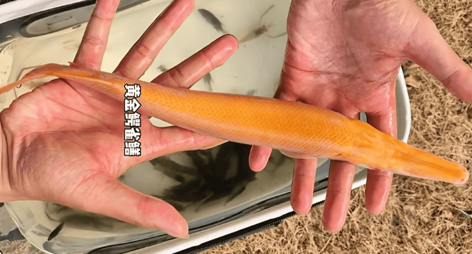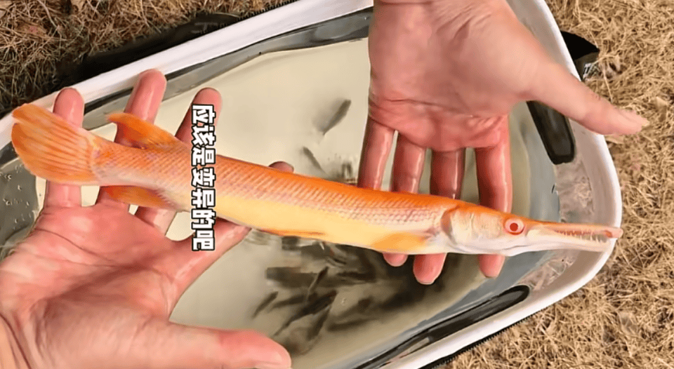 博主从水体上方进行拍摄的时候,可以看到这条鳄雀鳝的体型不算太大,后续博主将其捧在手上的时候,估摸着有3掌那么长,应该就是50厘米左右吧。其体色并非常规鳄雀鳝的灰绿色,而是饱和度相当高的橘黄色!可以说确实是非常好看,给鳄雀鳝原本就有点威武的外观多增加了些华丽。