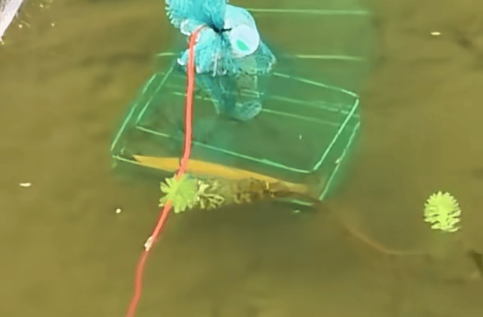 再华丽也是外来入侵物种!博主先是用鱼缸试着去钓,但完全不起效。于是他跑去菜市场买了些鸡肝,带着地笼子再次过来试图捕捉鳄雀鳝。将陷阱放置下去后,博主中途展示了很多这条河里的其他观赏鱼品种,这部分咱们就忽略了,不然把这些物种都介绍过去,文章得长死了。