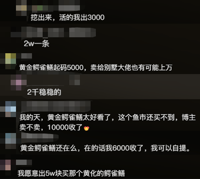 然后我收集了一下评论区的报价,从2000~20000元的报价都有。那些上万的可能就是喊着热闹的,根本什么都不懂,但是那些报价相对较低的人,似乎确实认为值得这个价钱,也是真心想要收购。相比之下,普通的鳄雀鳝米级以上的个体才堪堪超过千元,而这条不过50厘米左右就这么高价值了。