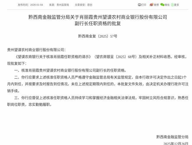 2026年1月4日,根据国家金融监督管理总局消息,《望谟农商银行关于核准肖丽霞任职资格的请示》获得通过,批复肖丽霞贵州望谟农村商业银行股份有限公司副行长的任职资格。