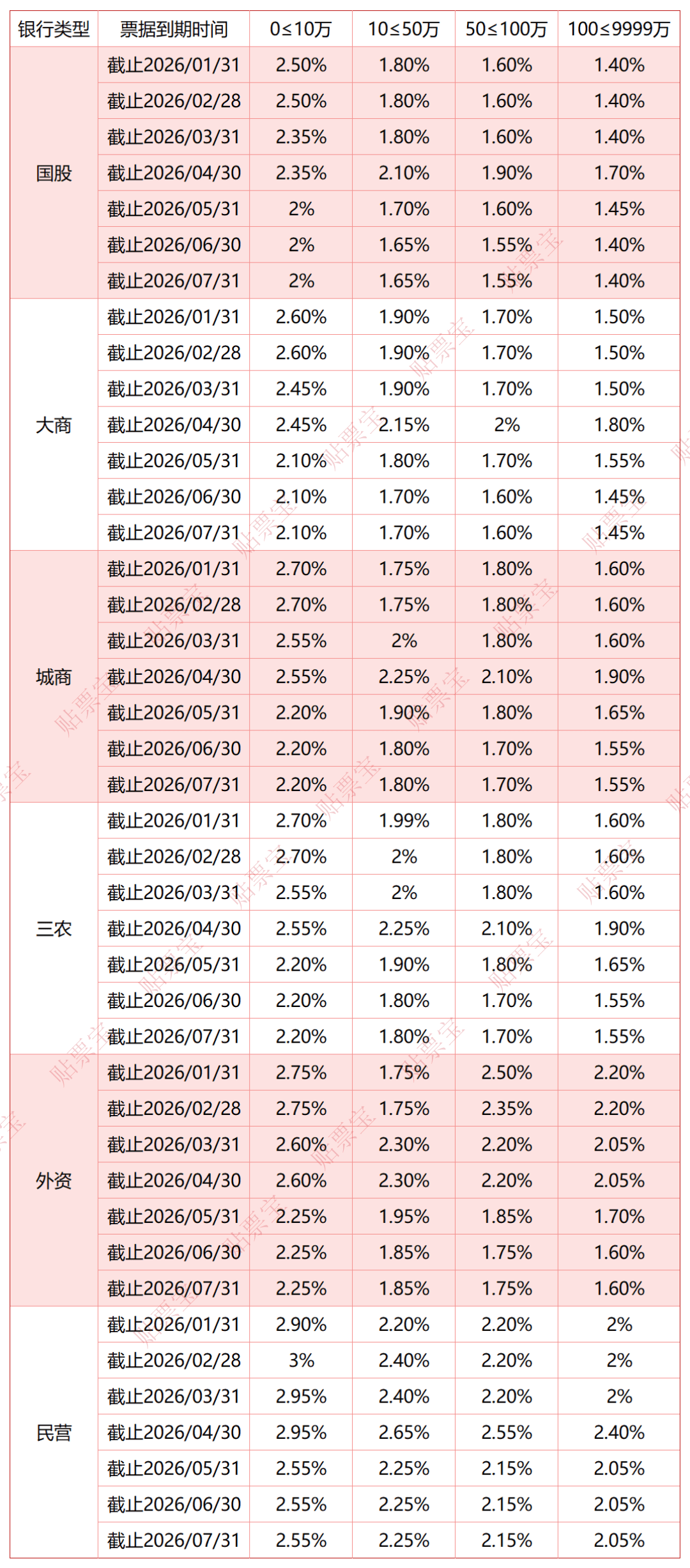 以下为2026年1月5日的银行承兑汇票贴现利率报价表(来源贴票宝):