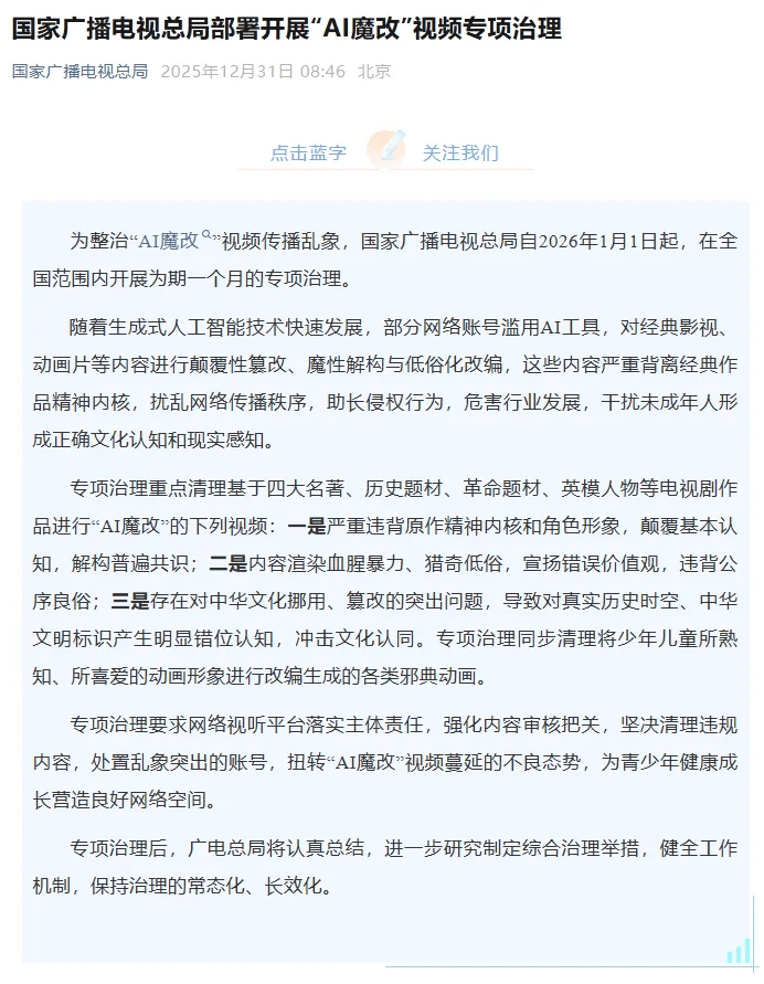 国家广播电视总局宣布自2026年1月1日起在全国范围内开展为期一个月的“AI魔改”视频专项治理,重点清理基于四大名著、历史题材、革命题材、英模人物等电视剧作品进行“AI魔改”的视频。