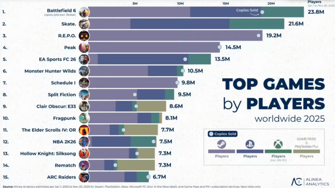 《战地风云6》以2380万购买玩家成为年度最畅销游戏;独立游戏持续崛起,预计将占Steam全年营收超25%。《RimWorld》DLC《Odyssey》成最卖座DLC,收入破千万美元。