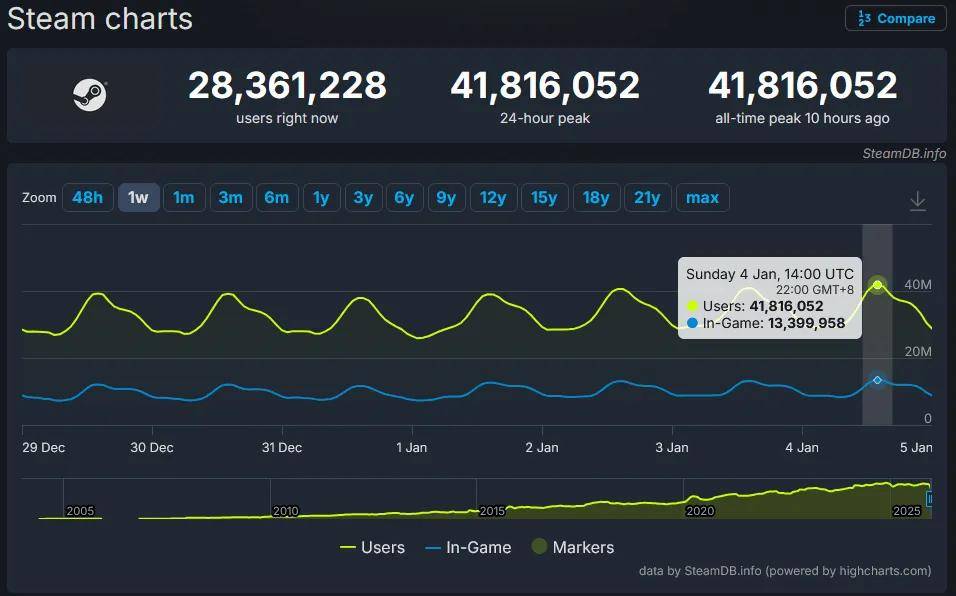 1月5日,据SteamDB数据,2026年元旦假期期间,Steam平台24小时在线玩家峰值达41,816,052人(约4181万),刷新历史纪录。此次峰值增长主要得益于2026新年假期特卖活动带动用户活跃度。