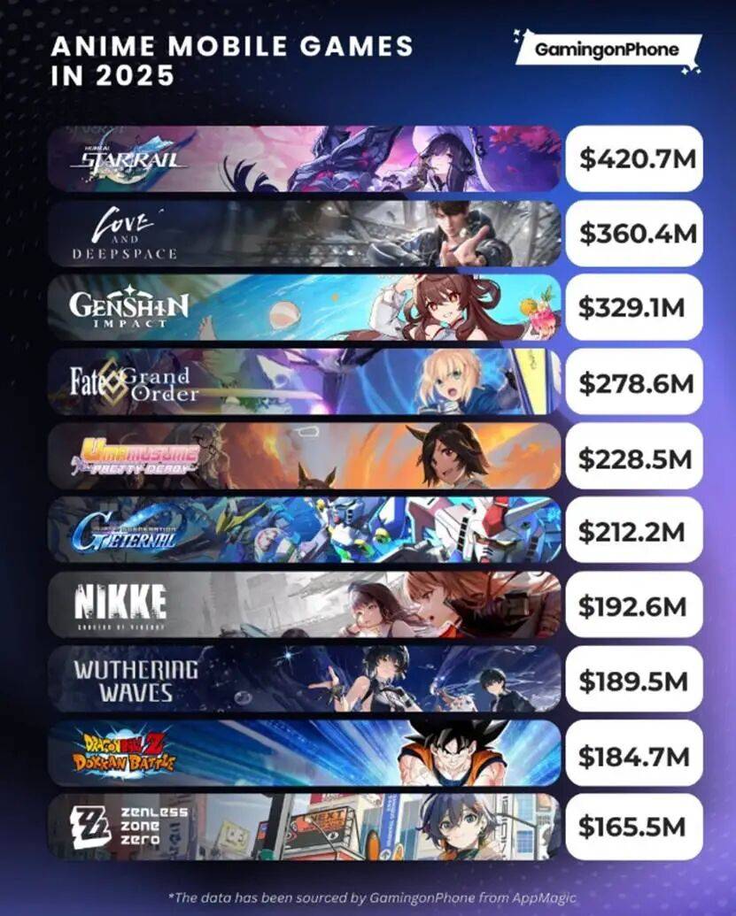 海外移动游戏媒体GamingonPhone近日发布了2025年全球营收前十的二次元手游榜单,相关数据由应用分析平台AppMagic提供。