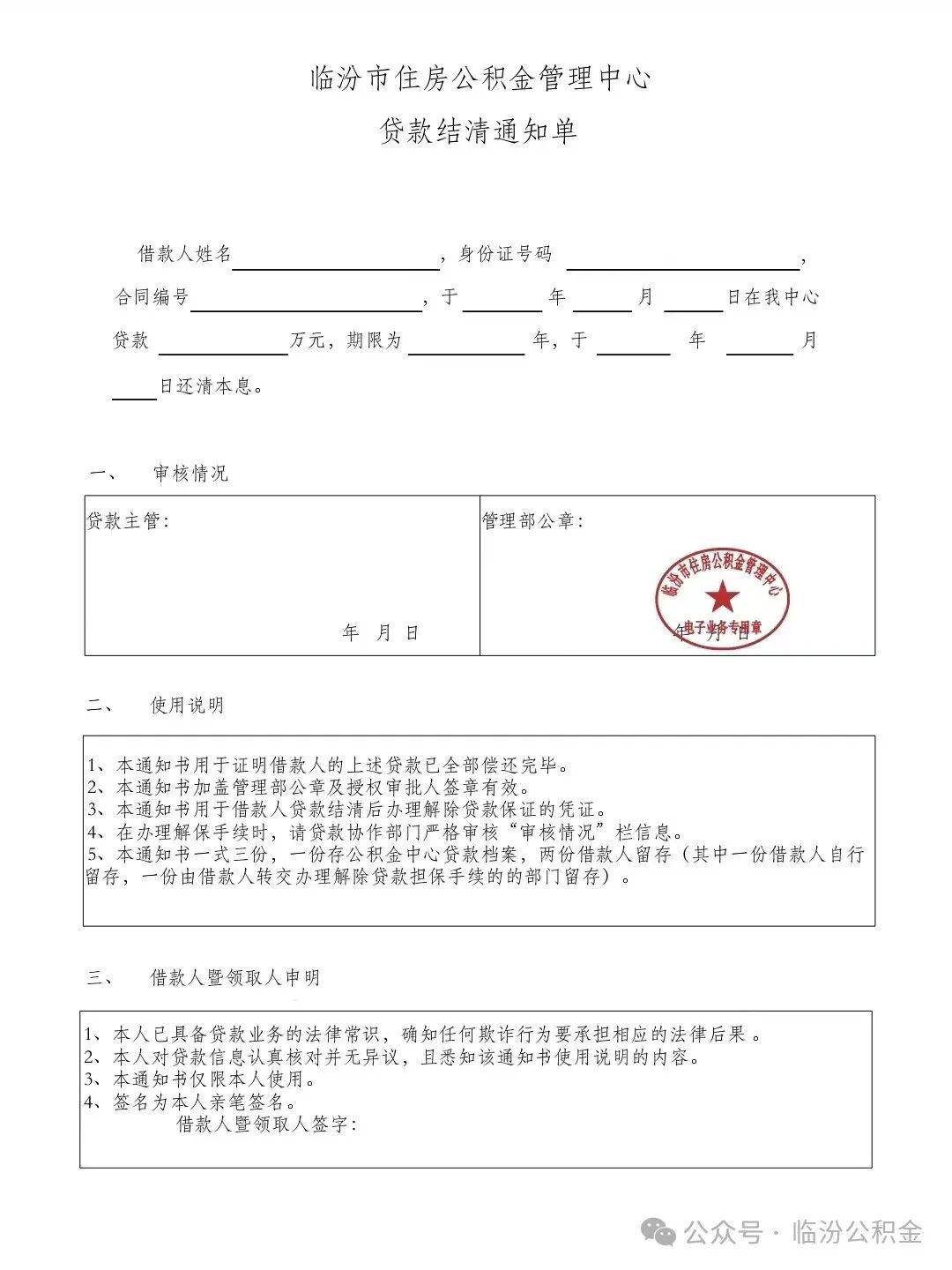 1、线上方式:关注并注册临汾公积金微信公众号,依次选择“ 个人服务-查询-贷款结清证明”,选择借款合同号,即可打印结清证明。