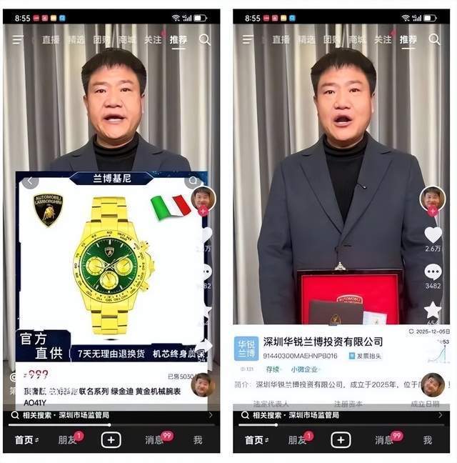 近日,百万粉丝博主“反诈老陈”在个人账号发布视频称,自己从某平台直播间购买的热销的“兰博基尼联名黄金手表”,疑似是假冒产品。