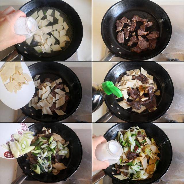 制作过程: 将卤熟牛肉、千张和大葱都切成片备用。烧锅水加入1小勺盐,将千张片放进锅中焯煮两分钟后捞出备用。 烧热锅放入适量的油, 将熟牛肉片放进锅中翻炒几下,加入千张片放进锅中翻炒几下,加入1勺生抽放进锅中翻炒上色,加入大葱段放进锅中煸炒出香味, 最后加入少许盐调味,翻炒均匀即可。