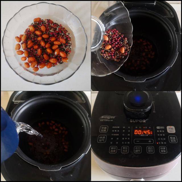 制作过程: 将花生米、黑米和糯米混合后洗净, 将其倒入电饭煲中,加入适量的水,按下电饭煲煮杂粮粥的功能键,时间到,“ 花生黑米粥”就煮好了。