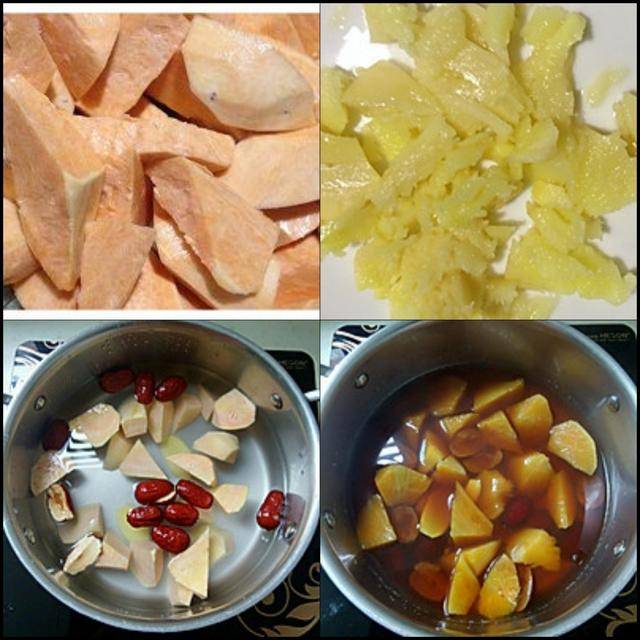 制作过程: 将红薯去皮后切成滚刀块; 老姜拍上几下再切成片备用; 红枣洗净备用;将准备好的食材的,生姜片、红薯块和红枣放入无油的锅中去煮,大火煮开后转为小火,继续炖煮20分钟, 按个人口味加入少许红糖融化,再泡上一会儿即可。