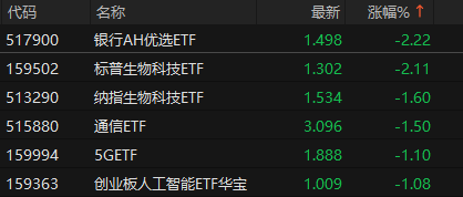 1月6日,ETF午间收盘涨跌不一,香港证券ETF易方达(513090)领涨4.46%,有色矿业ETF招商(159690)涨4.43%,工业有色ETF(560860)涨4.42%,银行AH优选ETF(517900)领跌2.22%,标普生物科技ETF(159502)跌2.11%,纳指生物科技ETF(513290)跌1.6%。