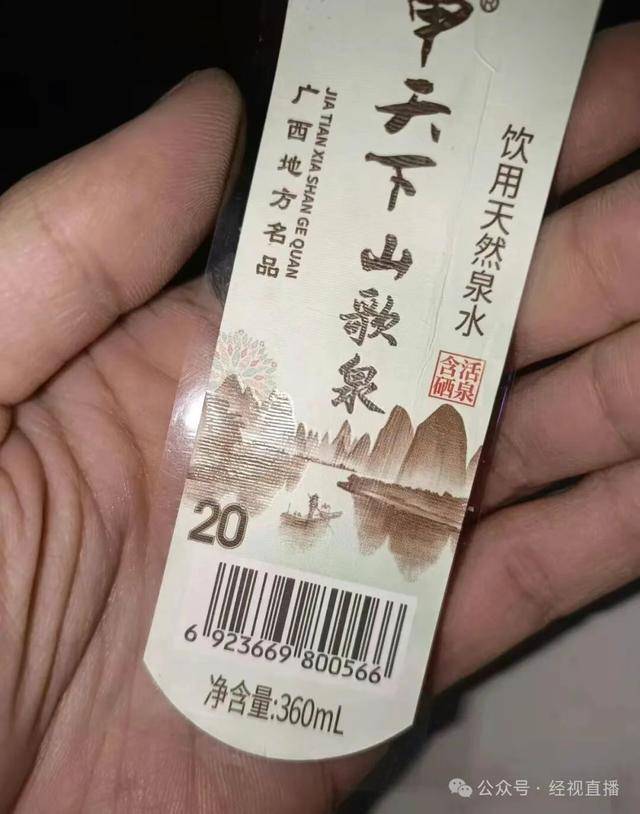图片显示,一张名为“广西地方名品”“甲天下山歌泉”的矿泉水标签下部,印有与第五套人民币20元纸币背面高度相似的桂林山水图案,并在图案左下角标注“20”字样。该图案采用具有凹凸反光质感,印刷工艺讲究。发帖网友表示:“还以为捡到钱了,这图案简直和人民币一模一样。”