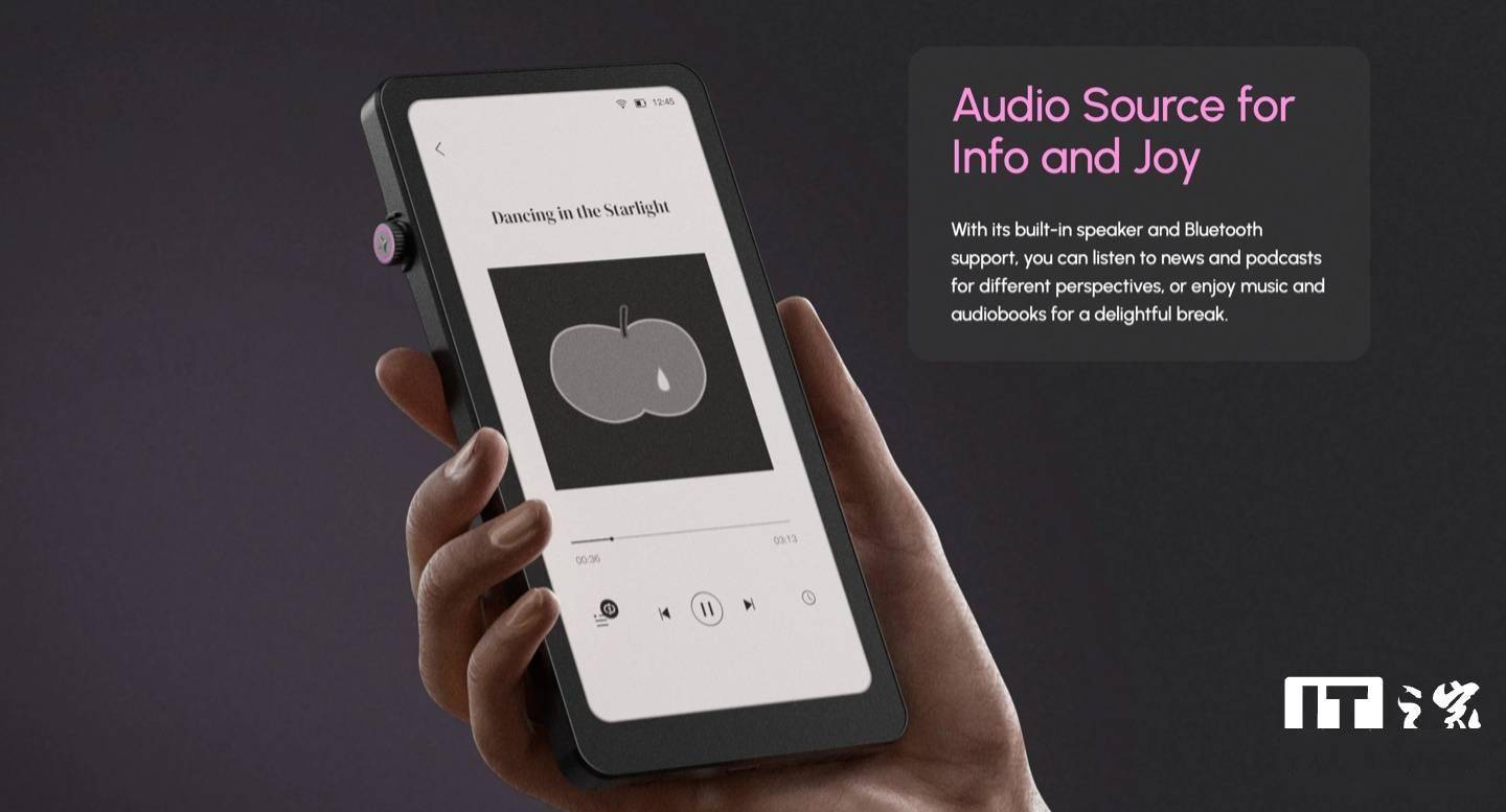 该产品造型简洁,可选黑白双色,整体尺寸为 154 x 80 x 9 mm,重量 173 克。机器正面配备了一块 6.13 英寸 824x1648 分辨率 Carta 1200 黑白墨水屏面板(300 PPI),带有可调双色温背光灯。机身左侧配备了一枚“智能旋钮”,用户可以通过旋转或按压来翻页、调整设置等,操作方式相当直观。