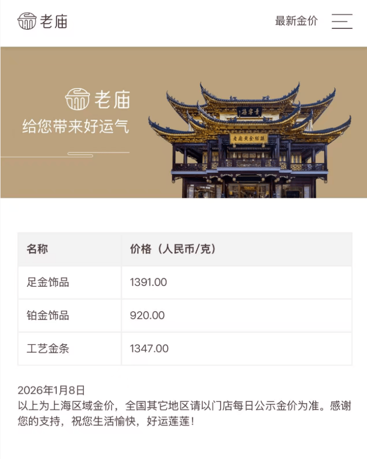 受此影响,国内金饰品牌价格也有小幅下跌。中新经纬8日查询发现,周生生足金饰品标价1394元/克,单日下跌3元/克;老凤祥足金饰品标价1396元/克,单日下跌3元/克。老庙黄金足金饰标价1391元/克,较前一日跌了11元/克,均结束此前三天连涨的走势。