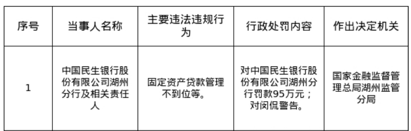罚单显示,中国民生银行股份有限公司湖州分行的主要违法违规事实(案由)为:固定资产贷款管理不到位等。