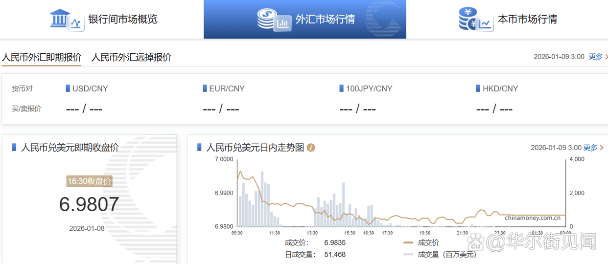 在岸人民币兑美元(CNY)北京时间03:00收报6.9835元,较周三夜盘收盘涨82点。成交量514.68亿美元。