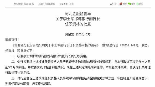 2026年1月9日,根据国家金融监督管理总局消息,《邯郸银行股份有限公司关于李士军副行长任职资格审核的请示》获得通过,批复李士军邯郸银行股份有限公司副行长的任职资格。