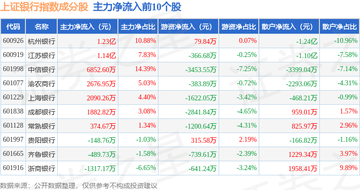 资金流向方面,上证银行(000134)指数成份股当日主力资金净流出合计9.09亿元,游资资金净流入合计5.18亿元,散户资金净流入合计3.92亿元。成份股资金流向详情见下表: