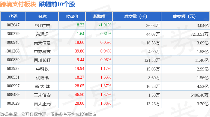 从资金流向上来看,当日跨境支付板块主力资金净流入6.27亿元,游资资金净流出12.56亿元,散户资金净流入6.3亿元。跨境支付板块个股资金流向见下表: