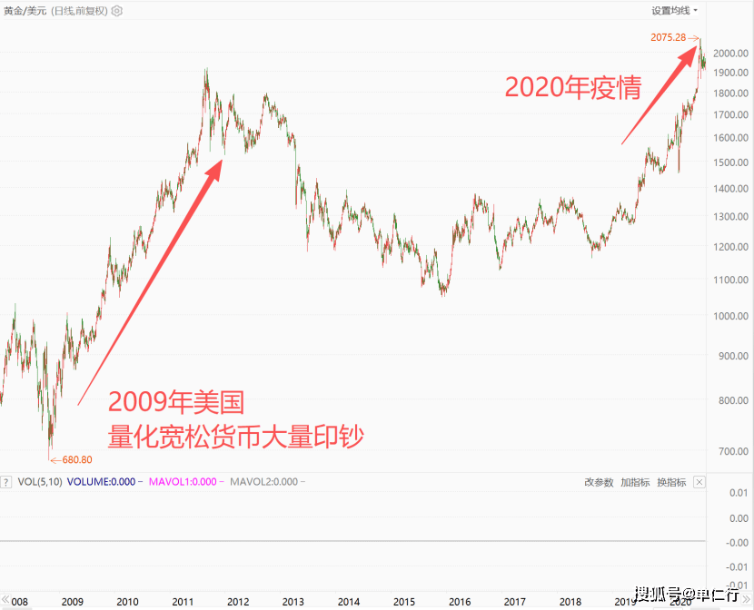 2008年金融危机期间,美国大幅度印钞推动经济复苏,金价从680美元/盎司飙升至1900美元/盎司。