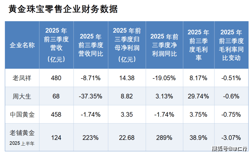 当然,行业中也存在少数逆势增长的特例,比如老铺黄金依靠高毛利的古法金产品和同店增长,2025年前三季度净利润同比增长289%,毛利率维持在39%以上。