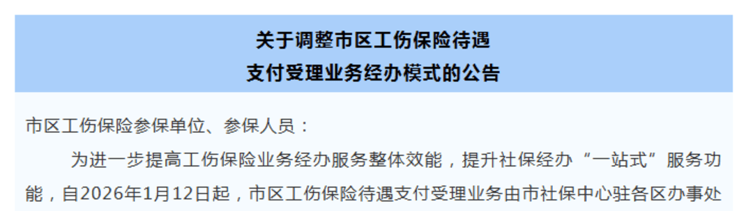 记者从无锡市社会保险基金管理中心获悉,为进一步提高工伤保险业务经办服务整体效能,提升社保经办“一站式”服务功能,自2026年1月12日起,无锡市区工伤保险待遇支付受理业务由无锡市社保中心驻各区办事处按辖区经办(其中建筑工程项目按项目所在地,其他单位按照单位注册地)。