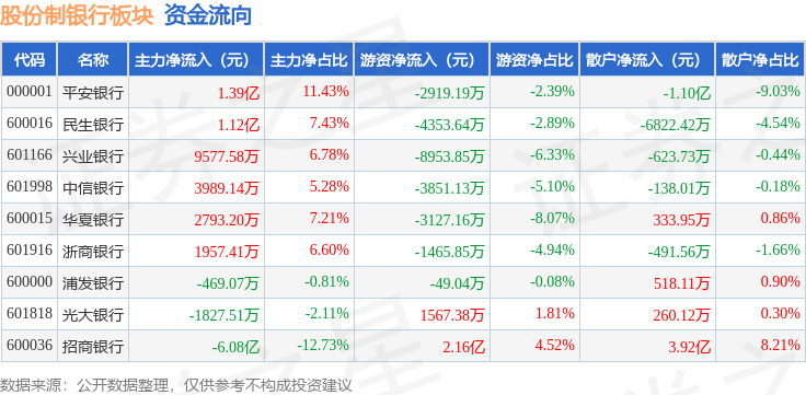 从资金流向上来看,当日股份制银行板块主力资金净流出1.96亿元,游资资金净流出1567.58万元,散户资金净流入2.12亿元。股份制银行板块个股资金流向见下表: