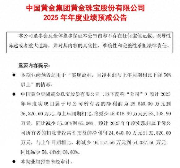 13日晚,中国黄金发布2025年年度业绩预减公告。