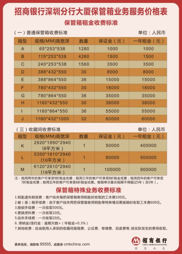 其中,招商银行在深圳仅两家网点提供保管箱服务:深圳分行营业部仅限金葵花及以上客户(金融资产50万元以上),最小箱年租1000元起;总行大厦营业部面向普通客户,最小箱年租300元起,但8000多个箱体已全部租满。