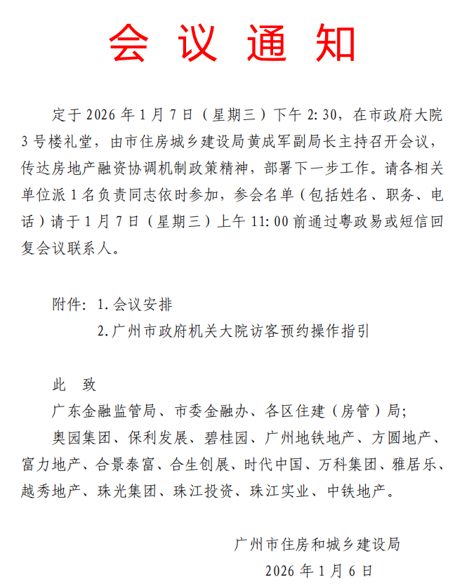 南都湾财社记者从一份流出的内部开会文件获悉,1 月 7 日下午,广州市住房城乡建设局已召集广东金融监管局、市委金融办,及各区住建(房管)局和房企开会,传达房地产融资协调机制政策精神,部署下一步工作。