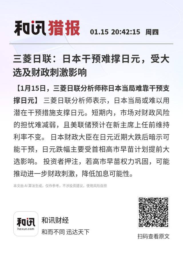 【1月15日,三菱日联分析师称日本当局难靠干预支撑日元】三菱日联分析师表示,日本当局或难以用潜在干预措施支撑日元。短期内,市场对财政风险的担忧难减弱,且美联储预计在新主席上任前维持利率不变。日本财政大臣在日元近期大跌后暗示可能干预,日元跌幅主要受首相高市早苗计划提前大选影响。投资者押注,若高市早苗权力巩固,可能推动进一步财政刺激,降低加息可能性。