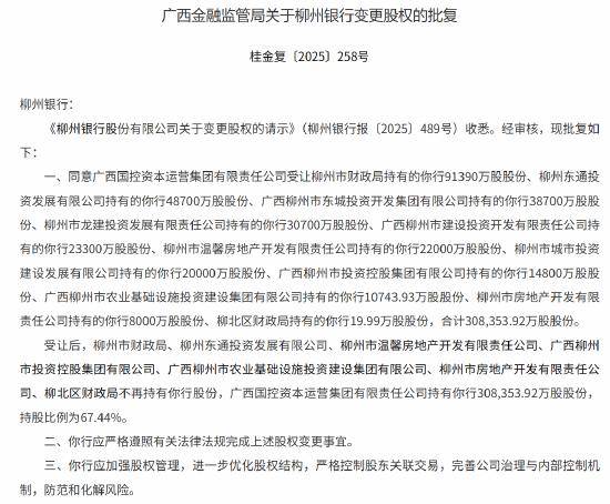 广西金融监管局已发布柳州银行股权变更批复,同意广西国控资本运营集团有限责任公司(以下简称“广西国控资本”)受让11家主体所持柳州银行股份,合计30.84亿股。