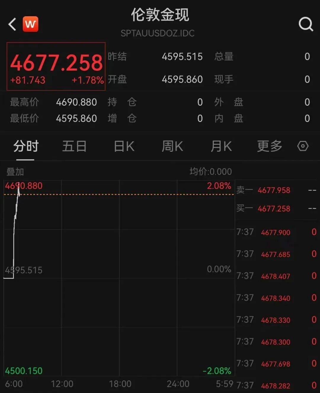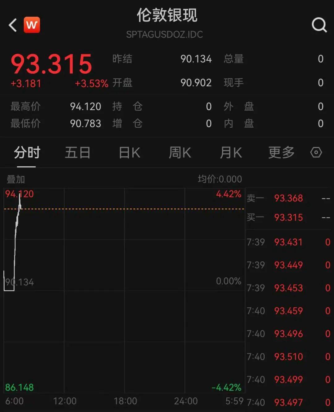现货黄金盘中涨超2%,突破4690美元/盎司,COMEX黄金涨超2%。白银价格上涨更为突出,伦敦银现向上触及94美元/盎司,日内上涨超4.4%,COMEX白银涨超5%,盘中最高触及94.365美元/盎司。均创历史新高。