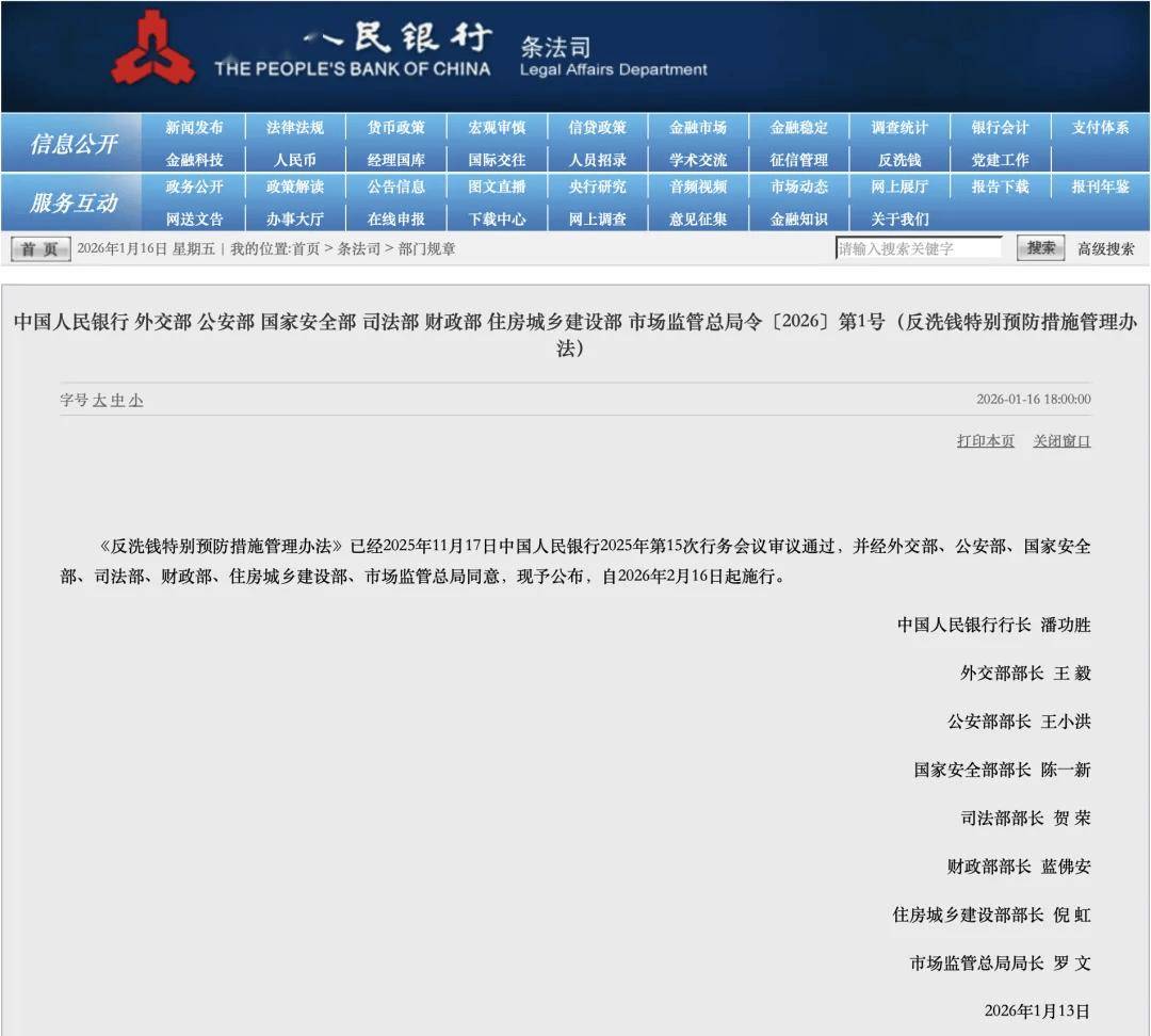 《反洗钱特别预防措施管理办法》已经2025年11月17日中国人民银行2025年第15次行务会议审议通过,并经外交部、公安部、国家安全部、司法部、财政部、住房城乡建设部、市场监管总局同意,现予公布,自2026年2月16日起施行。
