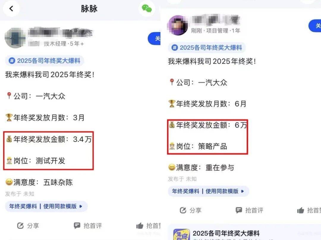 有员工爆料,测试开发岗位年终奖为3.4万元,相当于3个月月薪;策略产品岗位年终奖为6万元,相当于6个月月薪。