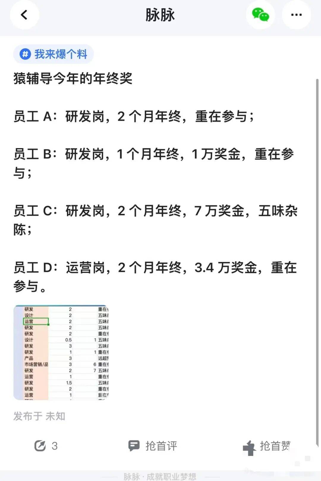 员工爆料显示,研发岗位有人获得2个月年终奖加7万元奖金,也有人仅获1个月年终奖;运营岗位普遍为2个月年终奖加3.4万元奖金,个别员工仅获0.5个月年终奖。