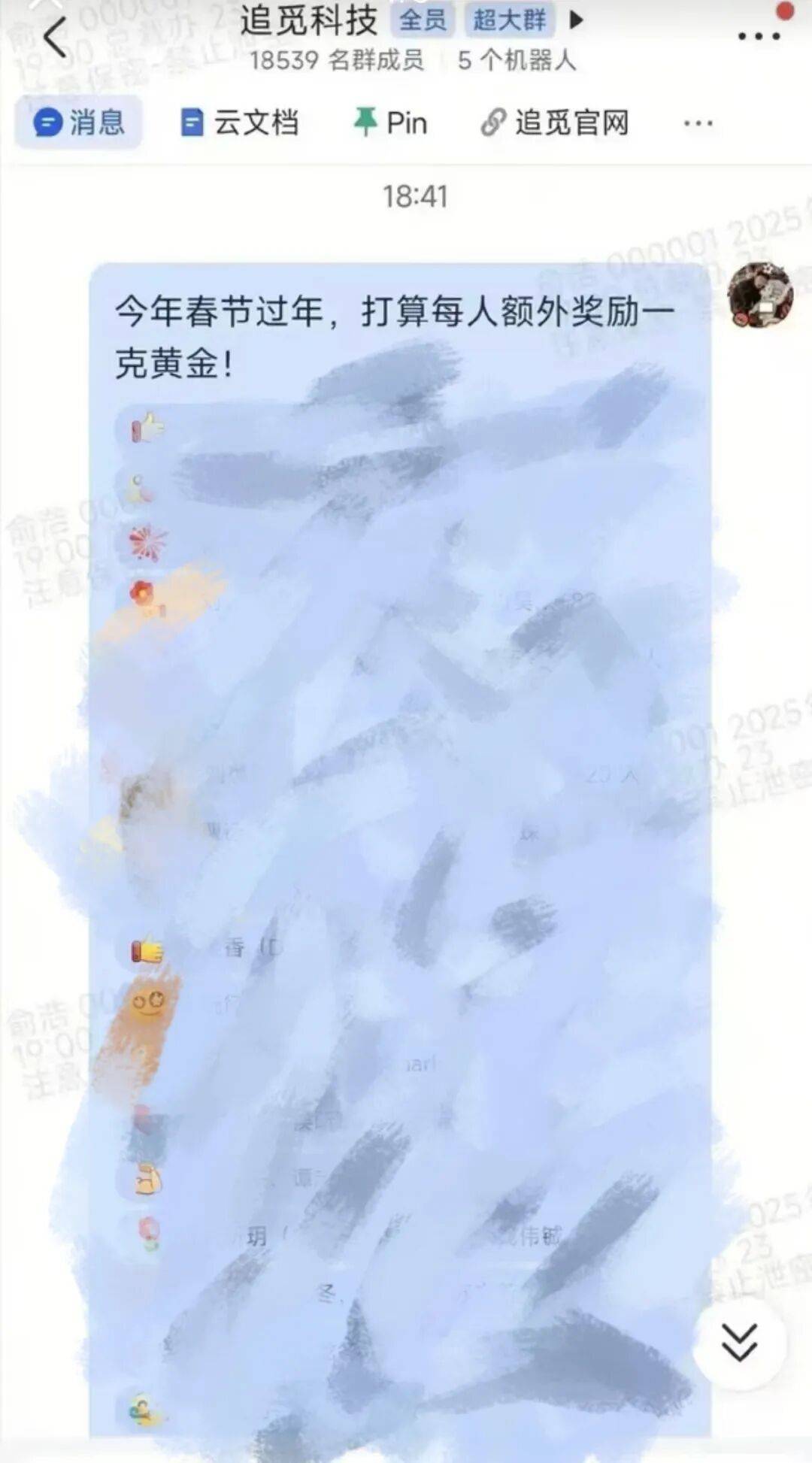 在常规年终奖之外,公司向全体员工额外发放1克黄金。按当前金价测算,此项支出约2600万元。创始人同时宣布奖励10名核心员工南极游。
