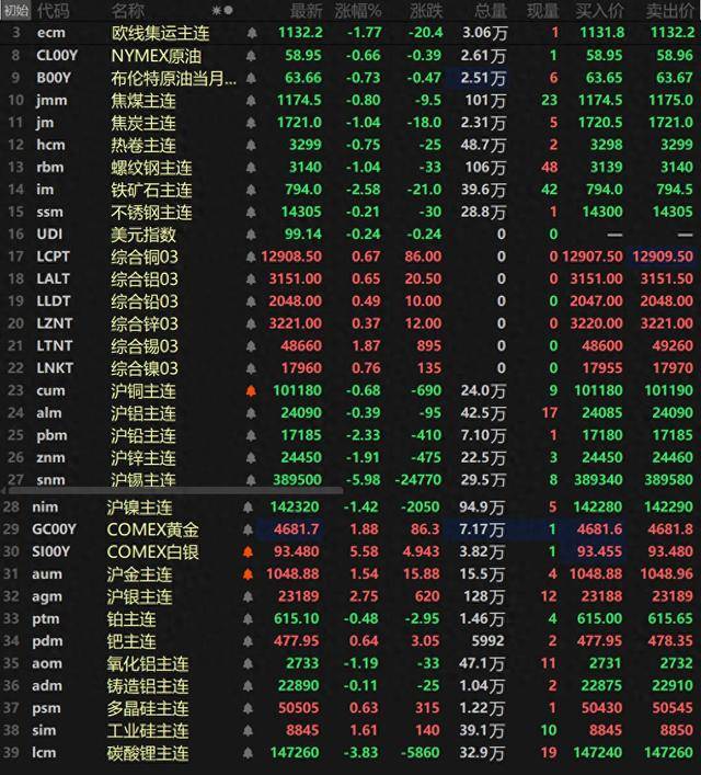 此外,碳酸锂主连跌3.83%,工业硅主连涨1.61%,多晶硅主连涨0.63%。欧线集运主连跌1.77%报1132.2。