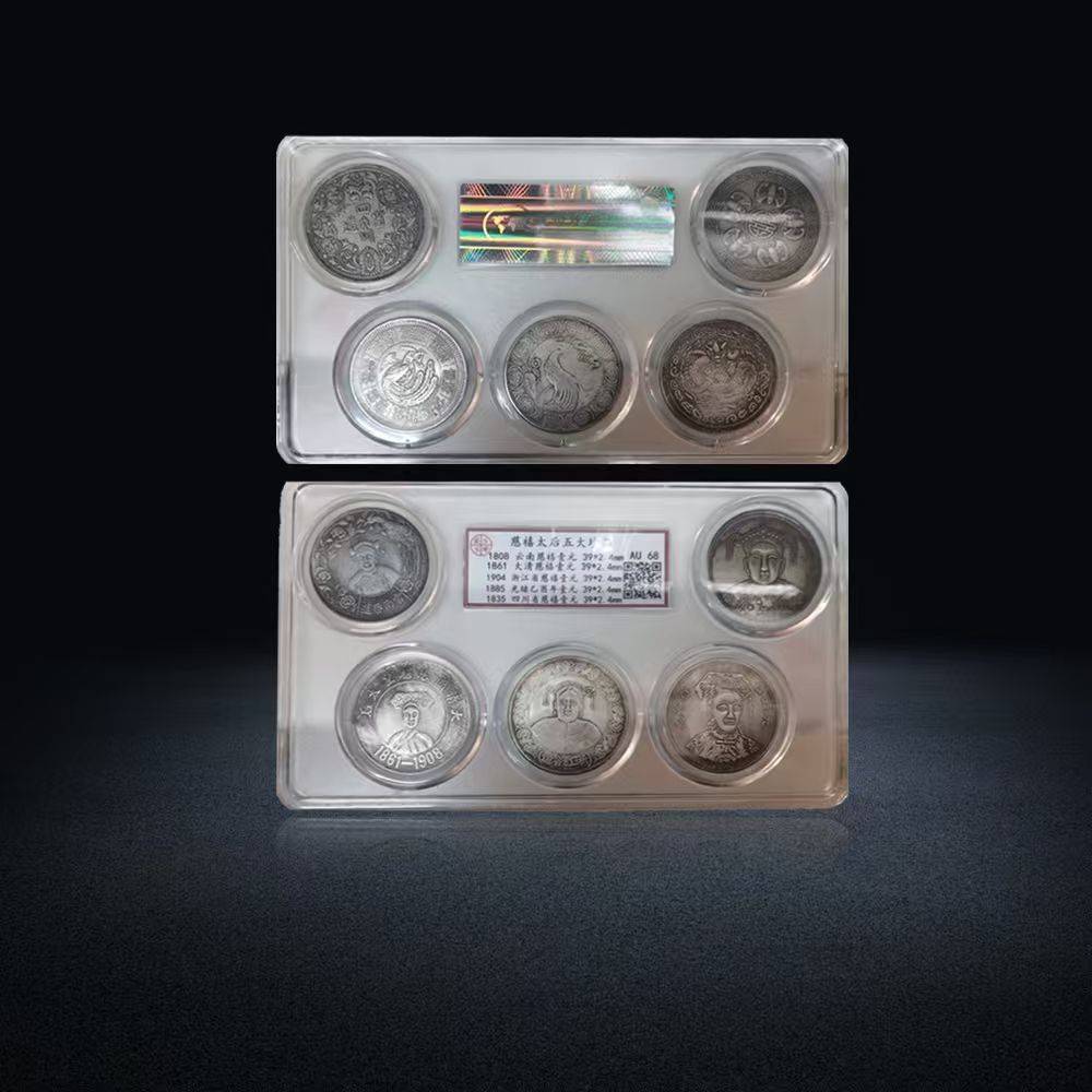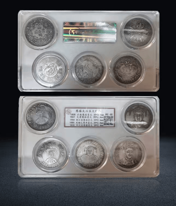 在中国清代机制币收藏的巅峰序列中,慈禧太后五大珍品银币套装(评级封装版) 以“宫廷专属、五局集齐、评级认证、存世极罕”四大核心特质,成为晚清权力符号与货币工艺的双重见证。这套封装版银币涵盖云南、大清、浙江、光绪乙酉年、四川五大铸币局的慈禧像纪念币,既是清代官方为慈禧太后寿辰特制的宫廷赏赐品,也是近现代钱币收藏中兼具历史价值、艺术价值与收藏价值的顶级藏品。