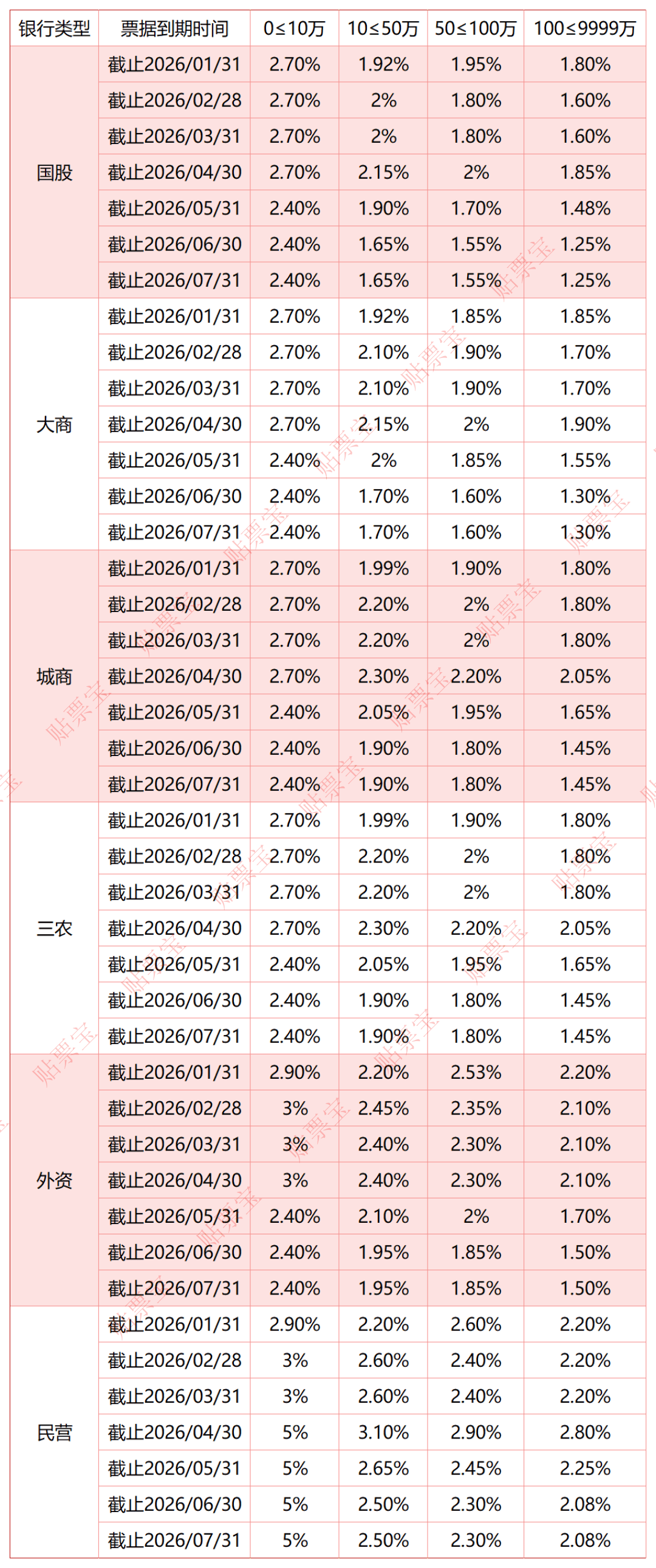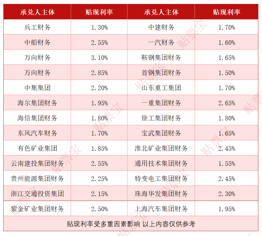 以下为2026年1月20日的银行承兑汇票贴现利率报价表(来源贴票宝):