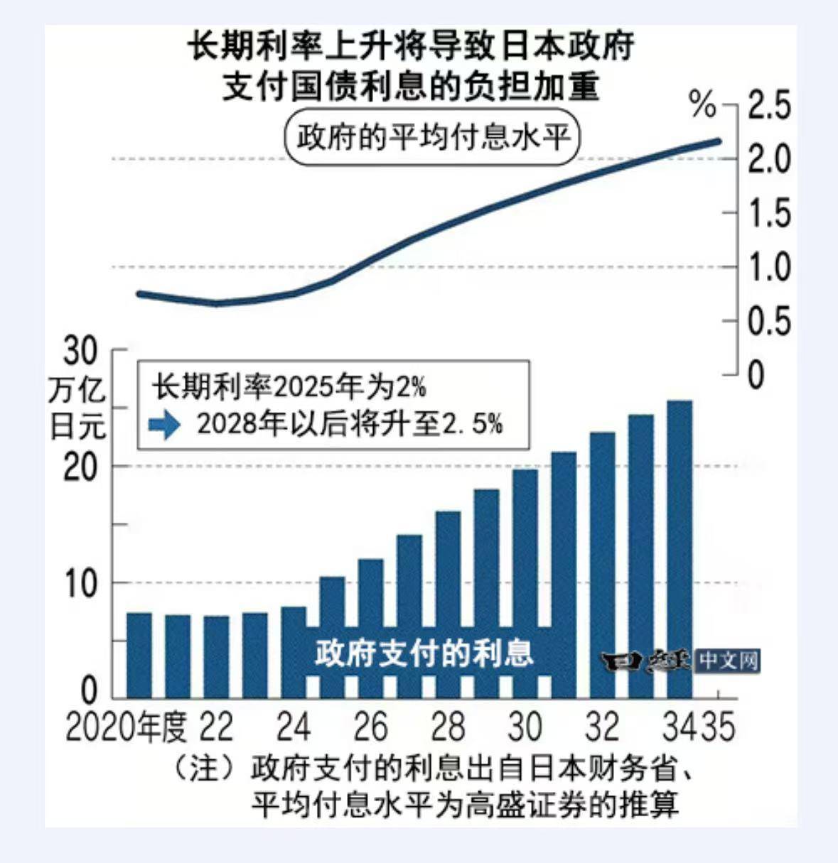 高盛数据显示,2024年度日本政府承担的国债的平均付息利率水平为0.75%。在日本央行压低利率的时代、以低利率发行的国债有很多尚未迎来偿还期。高盛估算,2026年日本政府承担的国债的付息利率水平将超过1%。2030年度为1.65%,2035年度达到2.16%,达到2024年度的近3倍。预计2040年达到2.48%。