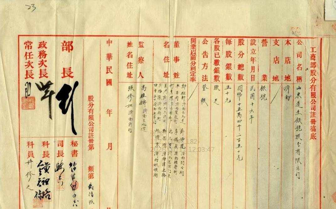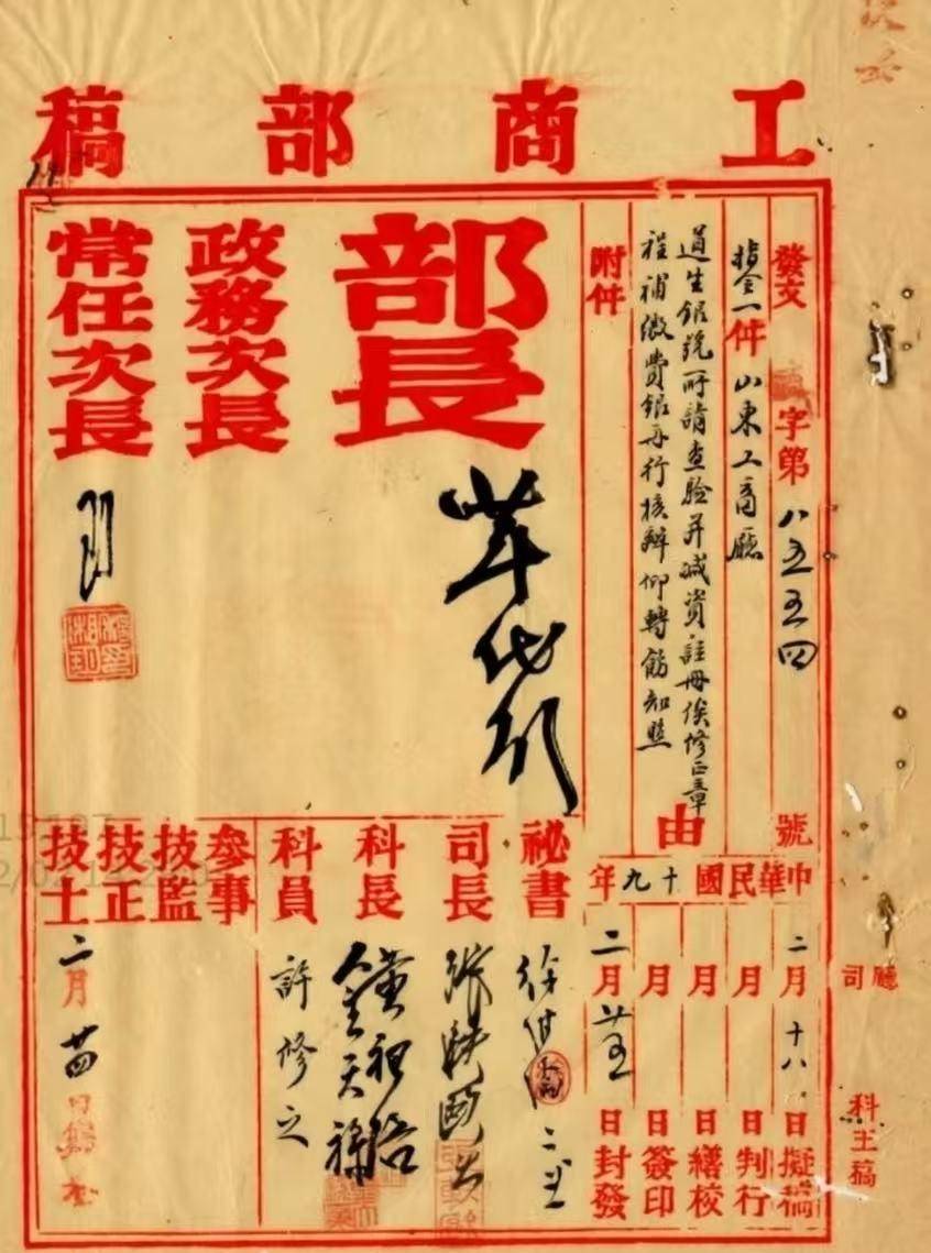 工商部接到山东省工商厅转呈的申报材料和文件后,经过工商部科员许修之办理,科长黄祖怡、金天禄审核,司长张轶欧复核,在1930年2月18日以商字第8554号令回复,认定道生银号既然原先没有领取执照,“碍难依照查验减资办法办理,应即按照现在资本总额呈请设立注册”。在工商部看来,此前道生银行“既并经地方官厅呈转注册有案,应报文件。除已报外,其余可免补具,以示通融”。但“至股本招收数目,应由现任董事、监察人全体依照《公司条例》第一百十四条逐项开具报告,补呈备核”。此外,工商部认为“所报《章程》,亦有未合之处,如股本总额若干,分为若干股,每股若干元,均应有明白规定”,并举例指出原《章程》第4条应酌改为“担任募集之股,不能以之为被选资格之股份”,原《章程》第13条“但”字下的原文应全删去等等。最后,工商部核定道生银号的“注册费照章应缴一百八十元,附加教育费三成,计银五十四元,又印花税壹元,共应缴银二百三十五元,除先后已共缴银十五元外,尚应补缴二佰二十元,仰即转饬遵照此令”。